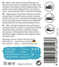 Õrnalt läbipaistmatu valge aine. Mis tahes siledast nahast või tekstiilmaterjalist valmistatud valge jalanõu / tossu jaoks. Ideaalne valgendaja jalatsi valgetele osadele. Katab kiiresti ja usaldusväärselt värvi muutnud kortsud ja praod. Kauakestev värvikate. Talub kõndimisel või jooksmisel tekkinud materjali kortsumist.